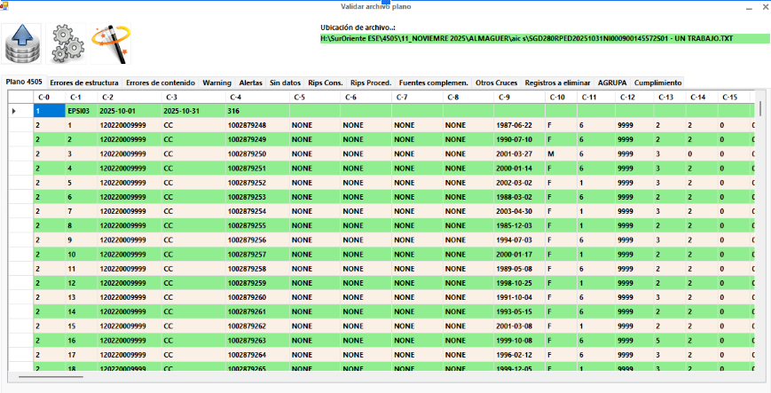 - Validación automática previa al envío: VALIDACIÓN PLANO 4505® revisa la estructura, longitud, formato y contenido de cada campo en tiempo real, detectando y alertando errores antes de confeccionar el archivo plano.