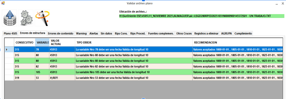 - Errores en la estructura del archivo: Los campos deben estar separados por el carácter pipe "|" y el archivo debe estar en formato texto plano (.TXT) con codificación ANSI.
